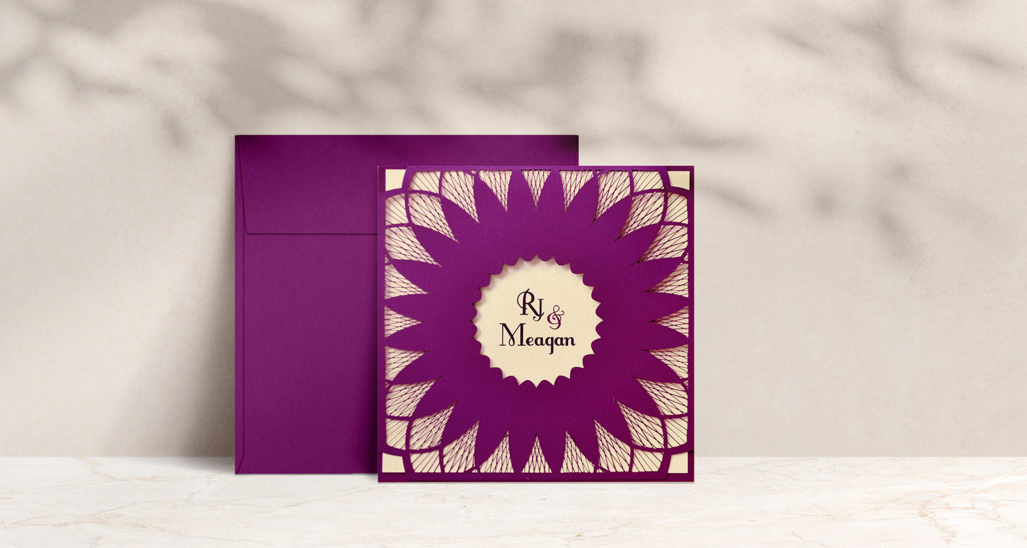 Being longtime lovers of both art and architecture, the Harpers had their heart set on a wedding invitation that was creative and unique. They wanted a design that showcased their wedding colors as well as their sunflower theme. The Harper wedding invitation is a celebration of the beauty and symmetry of a sunflower. Variations of straight and slanted lines curve and intersect to form an abstract sunflower design that is laser cut into the cover for added elegance and distinction.
